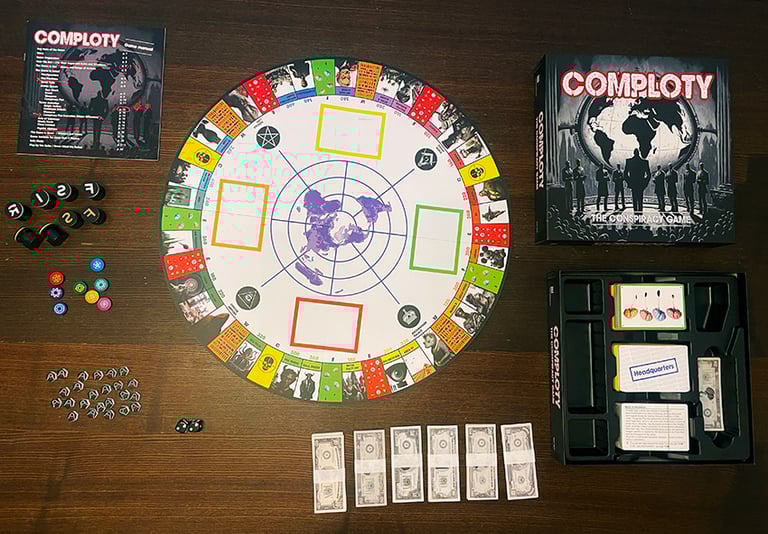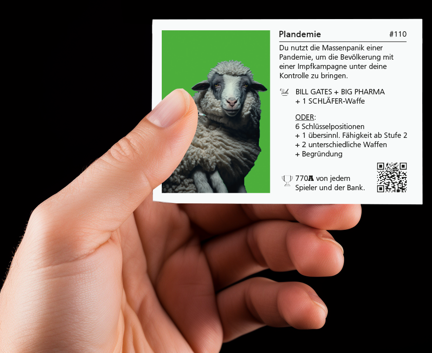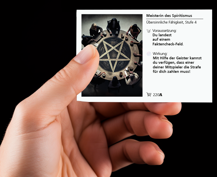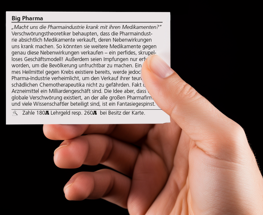 ⛧ Alle Organisationen, Charaktere, Handlungen, Ereignisse und Geschichten in COMPLOTY basieren auf Verschwörungstheorien, die tatsächlich so oder so ähnlich verbreitet werden. Wenn ein Spieler auf dem Feld "Faktencheck" landet, werden die Verschwörungsmythen einer kritischen Prüfung unterzogen. Jeder Faktencheck ist einer anderen Verschwörungserzählung gewidmet. Die Betrachtung erfolgt aus der Perspektive der etablierten 'Mainstream'-Wissenschaft und endet daher meist unangenehm für die Spieler – nämlich mit einer heftigen Strafe.