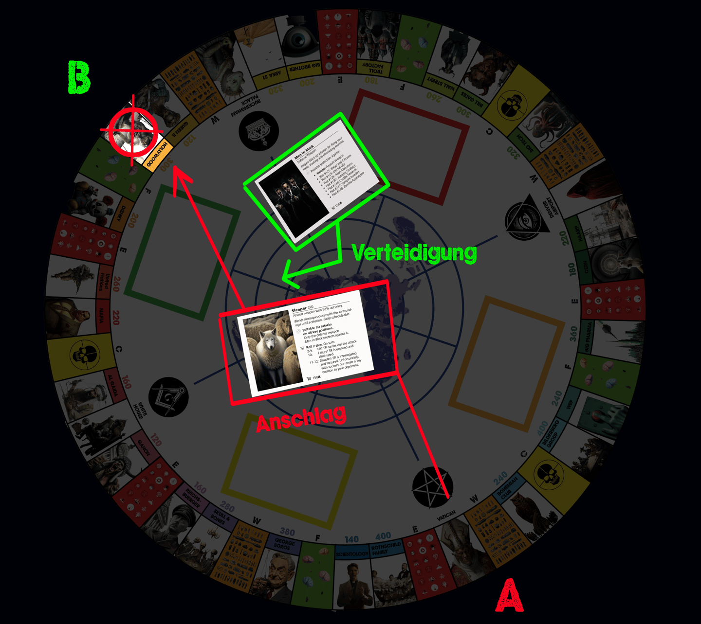 ⛧ Diese Schlüsselpositionen sind auf 24 Felder auf dem Spielbrett verteilt. Du kannst eine Schlüsselposition kaufen, wenn du mit deiner Spielfigur auf dem entsprechenden Feld landest und dir noch kein Gegner zuvorgekommen ist. Wenn die Position bereits besetzt ist, musst du dem Besitzer ein Schutzgeld entrichten. Oder du kannst deine Geheimwaffen einsetzen und die Position mit Gewalt unter deine Kontrolle bringen. (→ Terroraktivitäten). Das gilt auch für (unbesetzte) Schlüsselpositionen, die der Schattenbank gehören.
