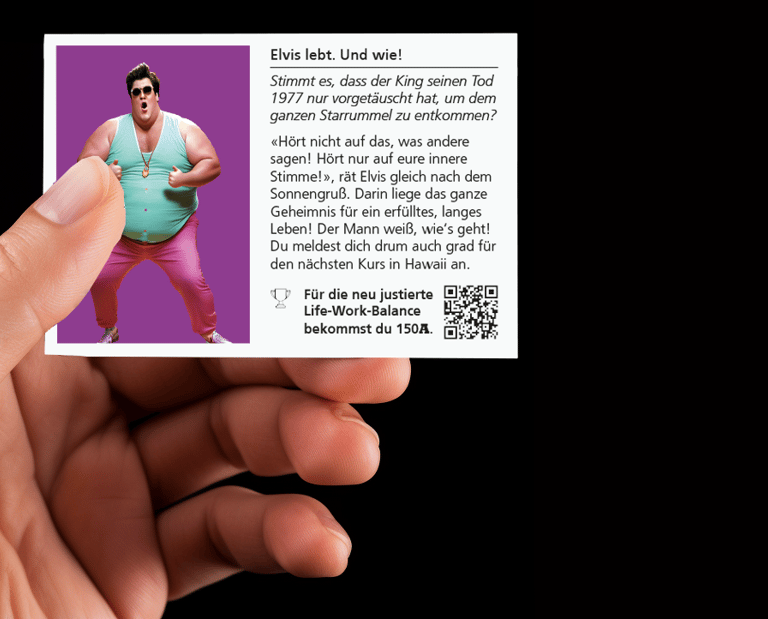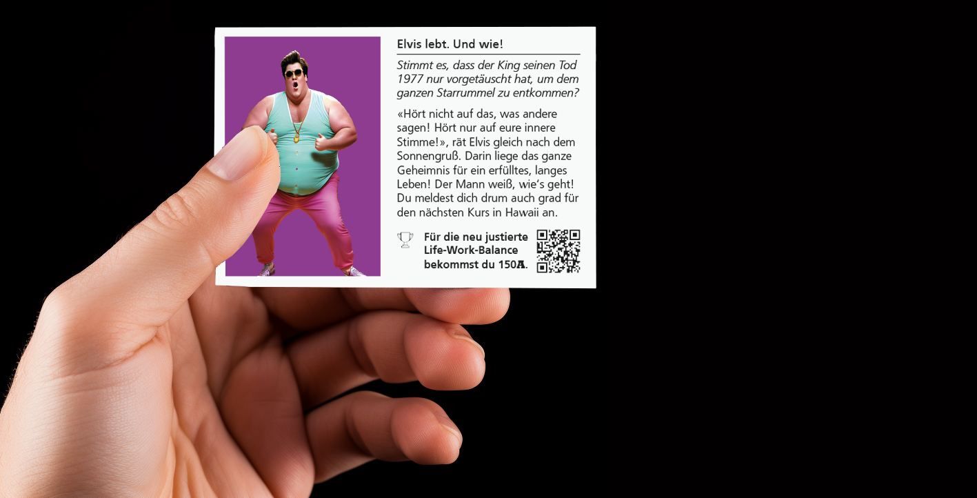 👁️⃤ Erlebe aus erster Hand die ungeheuerlichsten und skandalösesten Ereignisse der Geschichte, die bis heute Gegenstand vieler Verschwörungstheorien sind – von "Elvis lebt" bis Pizzagate. (Wenn du mehr darüber erfahren willst, kannst du den QR-Code auf der Karte scannen.)