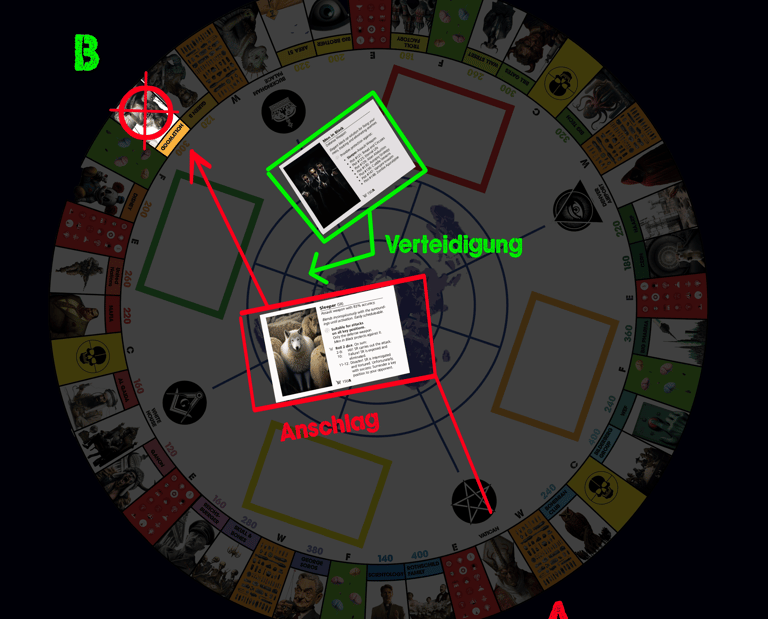 ⛧ Dein Handlungsspielraum umfasst verschiedene Terroraktivitäten: Einzelangriffe (auf Schlüsselpositionen), Kamikaze-Angriffe (auf Terrorzellen), Massaker (auf feindliche Hauptquartiere) und Grossoffensive (= Umsetzung eines Komplottplans). Ausserdem kannst du deine Schlüsselpositionen in Terrorzellen umbauen. Oder du kannst die Spielzüge deiner Gegner stören, indem du entweder Sabotagewaffen oder übernatürliche Kräfte (→ übersinnliche Fähigkeiten) einsetzt.. Alle Arten von Attacken sind in der Spielanleitung mit leicht verständlichen Beispielen beschrieben.