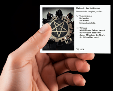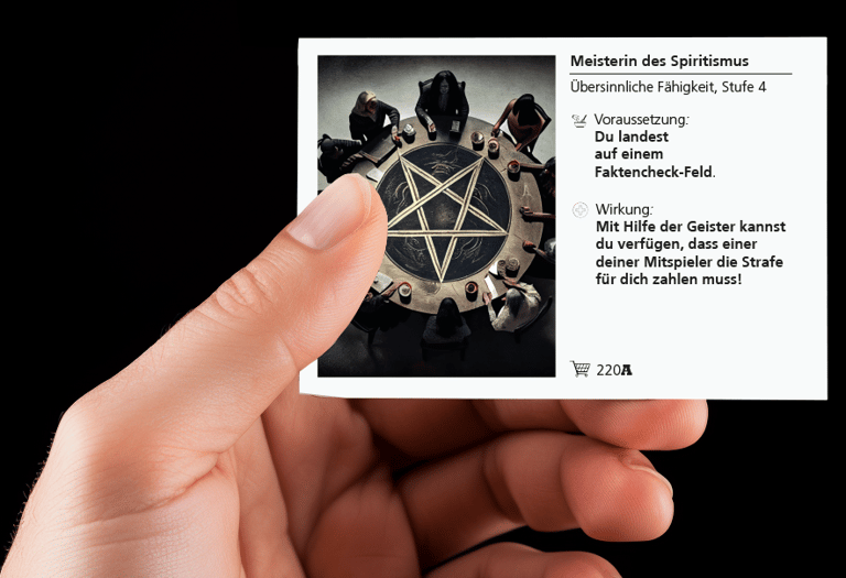 ⛧ Alle Organisationen, Charaktere, Handlungen, Ereignisse und Geschichten in COMPLOTY basieren auf Verschwörungstheorien, die tatsächlich so oder so ähnlich verbreitet werden. Wenn ein Spieler auf dem Feld "Faktencheck" landet, werden die Verschwörungsmythen einer kritischen Prüfung unterzogen. Jeder Faktencheck ist einer anderen Verschwörungserzählung gewidmet. Die Betrachtung erfolgt aus der Perspektive der etablierten 'Mainstream'-Wissenschaft und endet daher meist unangenehm für die Spieler – nämlich mit einer heftigen Strafe.